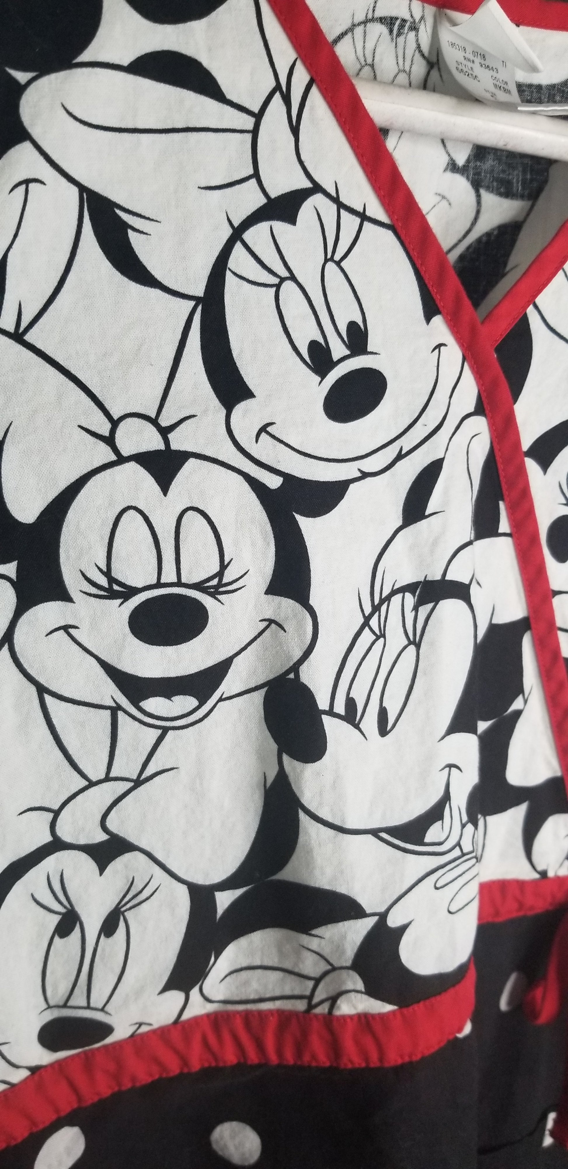 This Minnie Mouse Scrub Top has two pockets on the front. The waist line is lined with elastic so it created the synching effect. There is also a tie around the waist that can be tied into a bow.