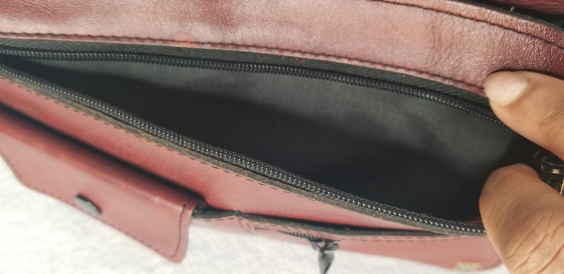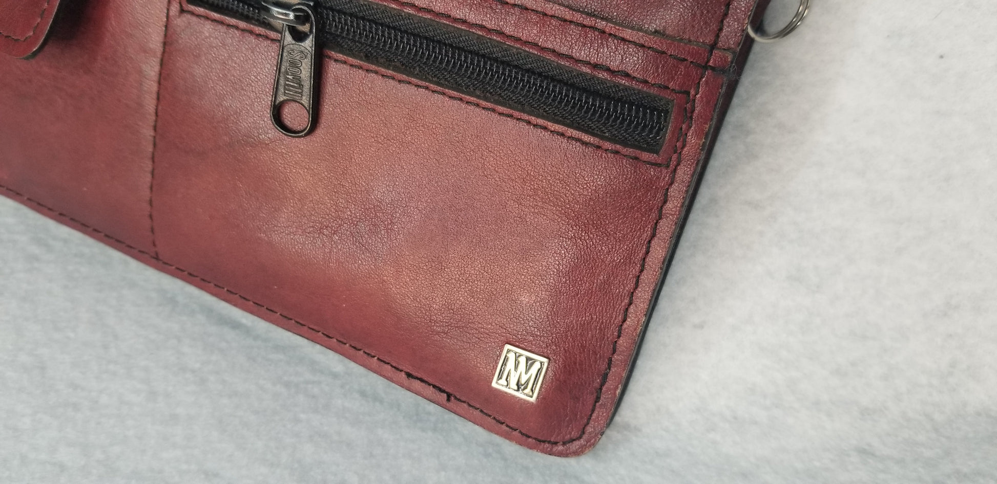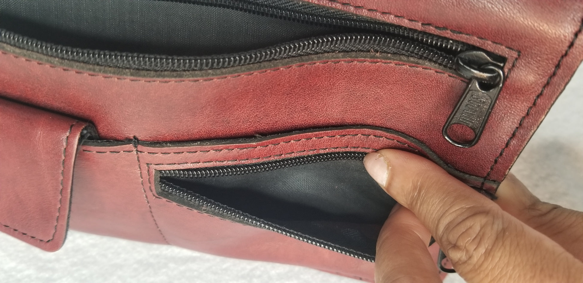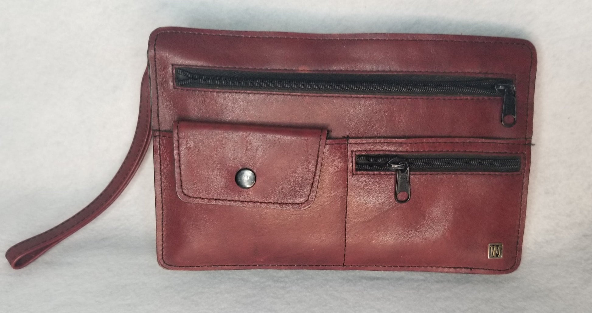 There is a flip button pocket and a small zip pocket on the front of the purse. There is a large zip pocket on the front as well. There is a large zip pocket across the back and a wrist strap. This wallet is in great shape! There is one spot on the front with slight discoloration as shown in pictures.